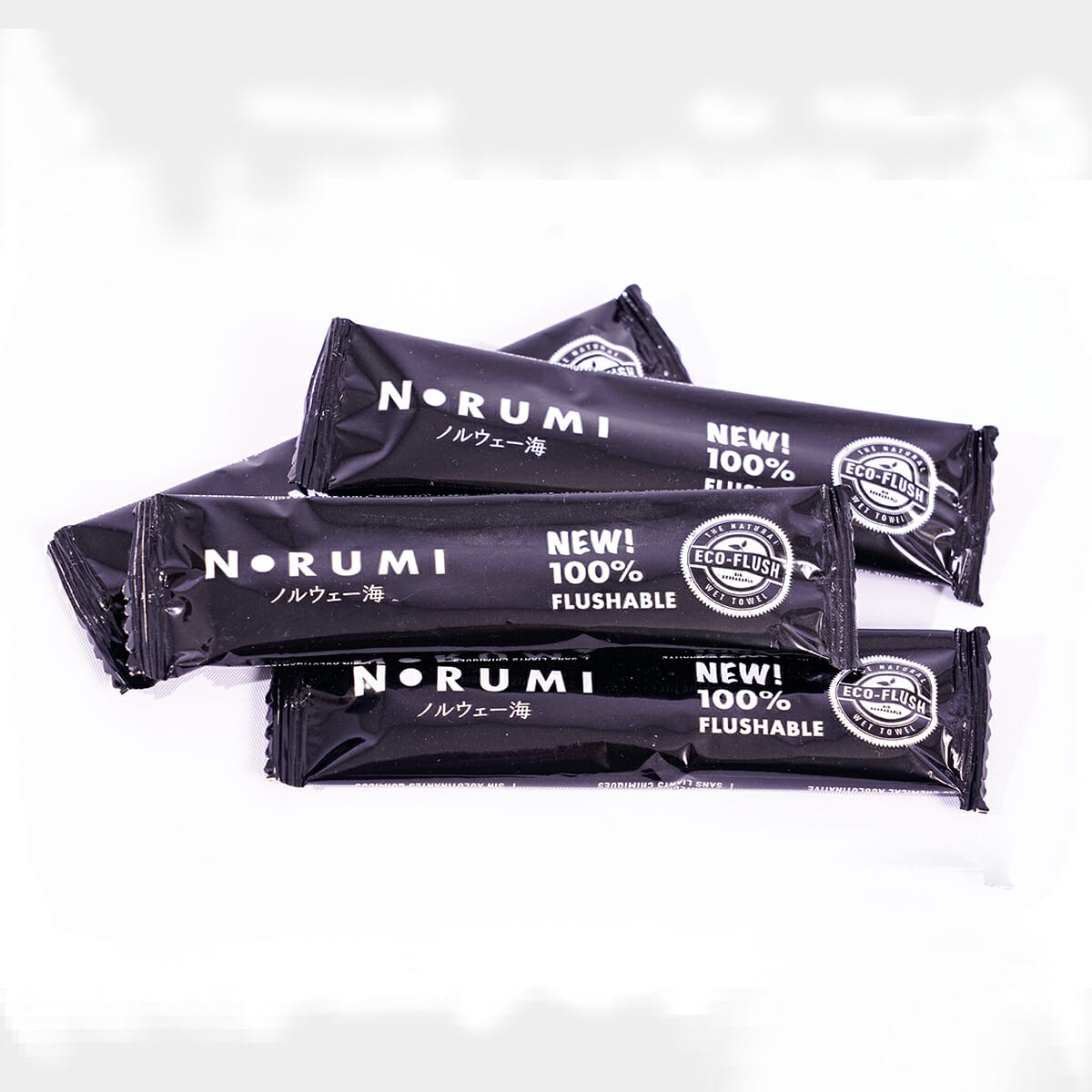 Våtserviett i hygienisk, enkel innpakning med utvendig trykk.